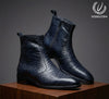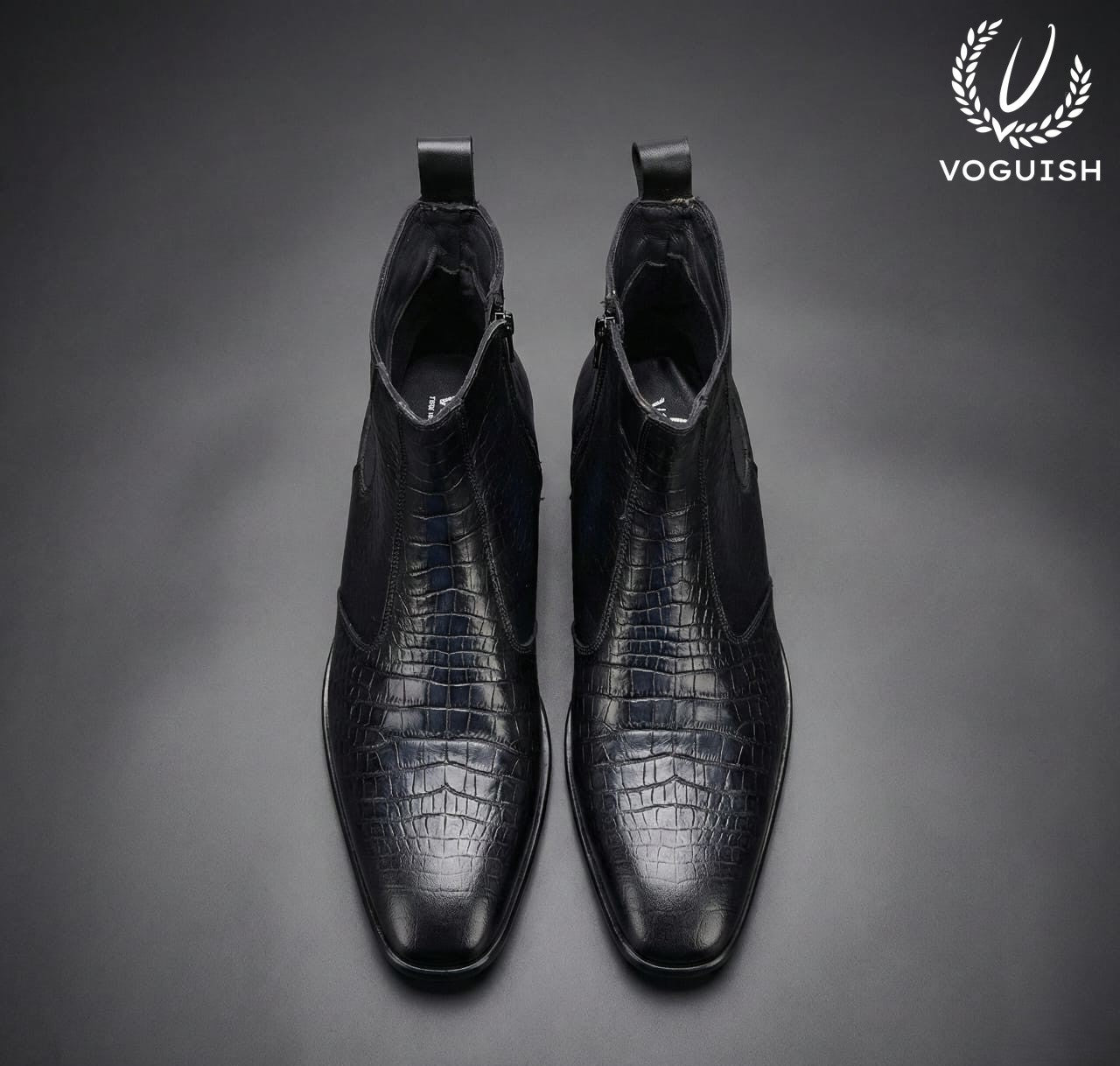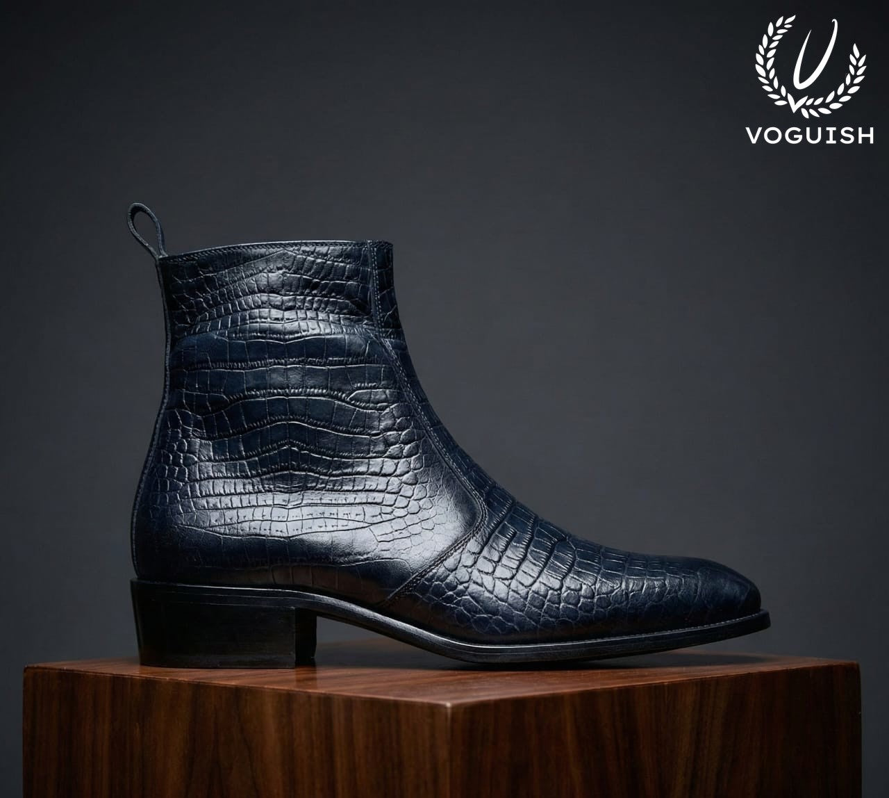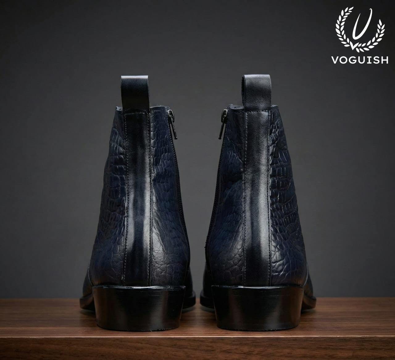 Elevate your footwear game with a silhouette that balances classic craftsmanship with a bold, modern edge. These ankle boots are meticulously crafted from premium leather, featuring a deep Midnight Navy finish and a striking crocodile-embossed texture that catches the light from every angle.