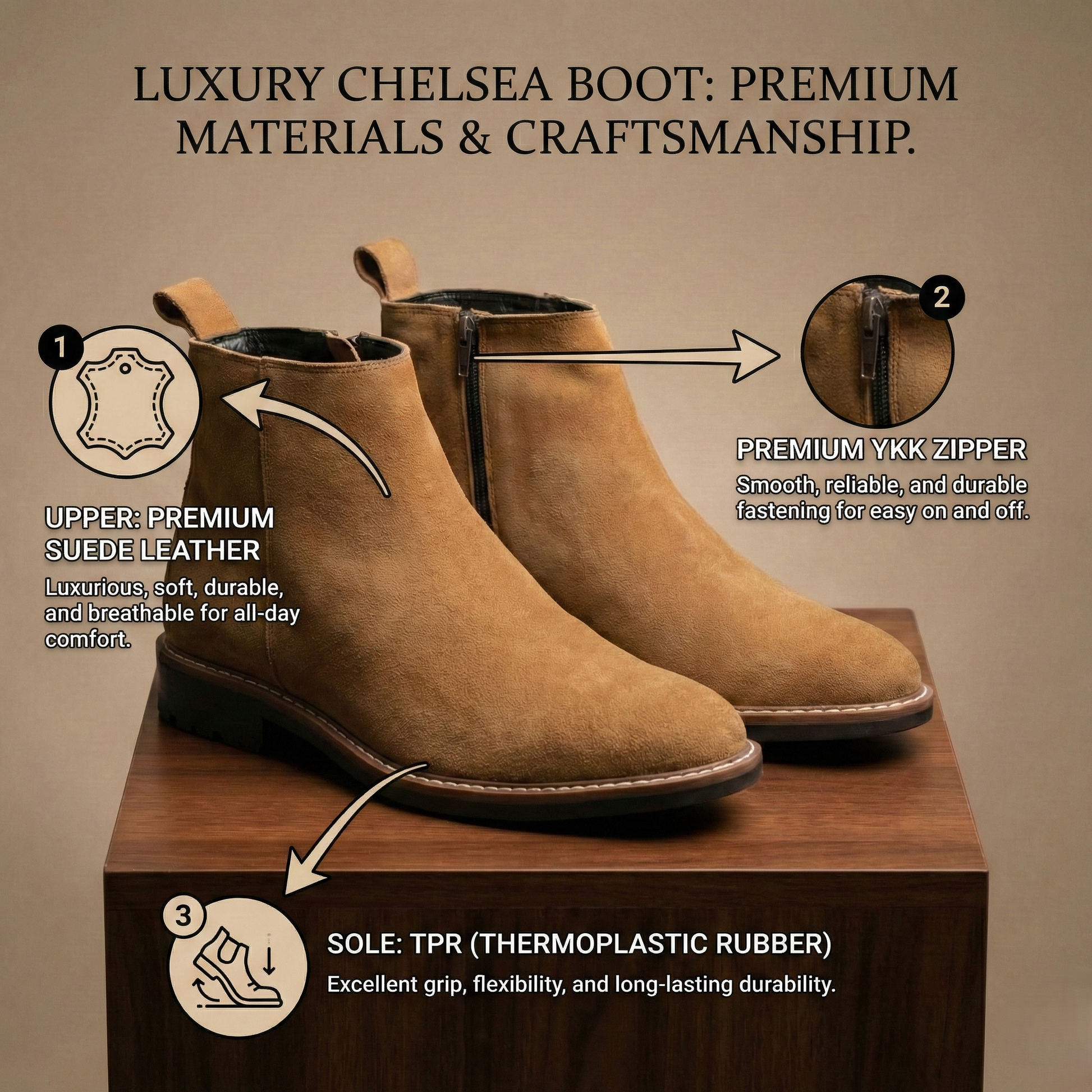 Elevate your everyday rotation with a boot that balances classic heritage with modern convenience. Crafted from premium, textured suede in a warm tan hue, these boots offer a versatile silhouette that transitions seamlessly from a casual denim look to a more tailored office ensemble.