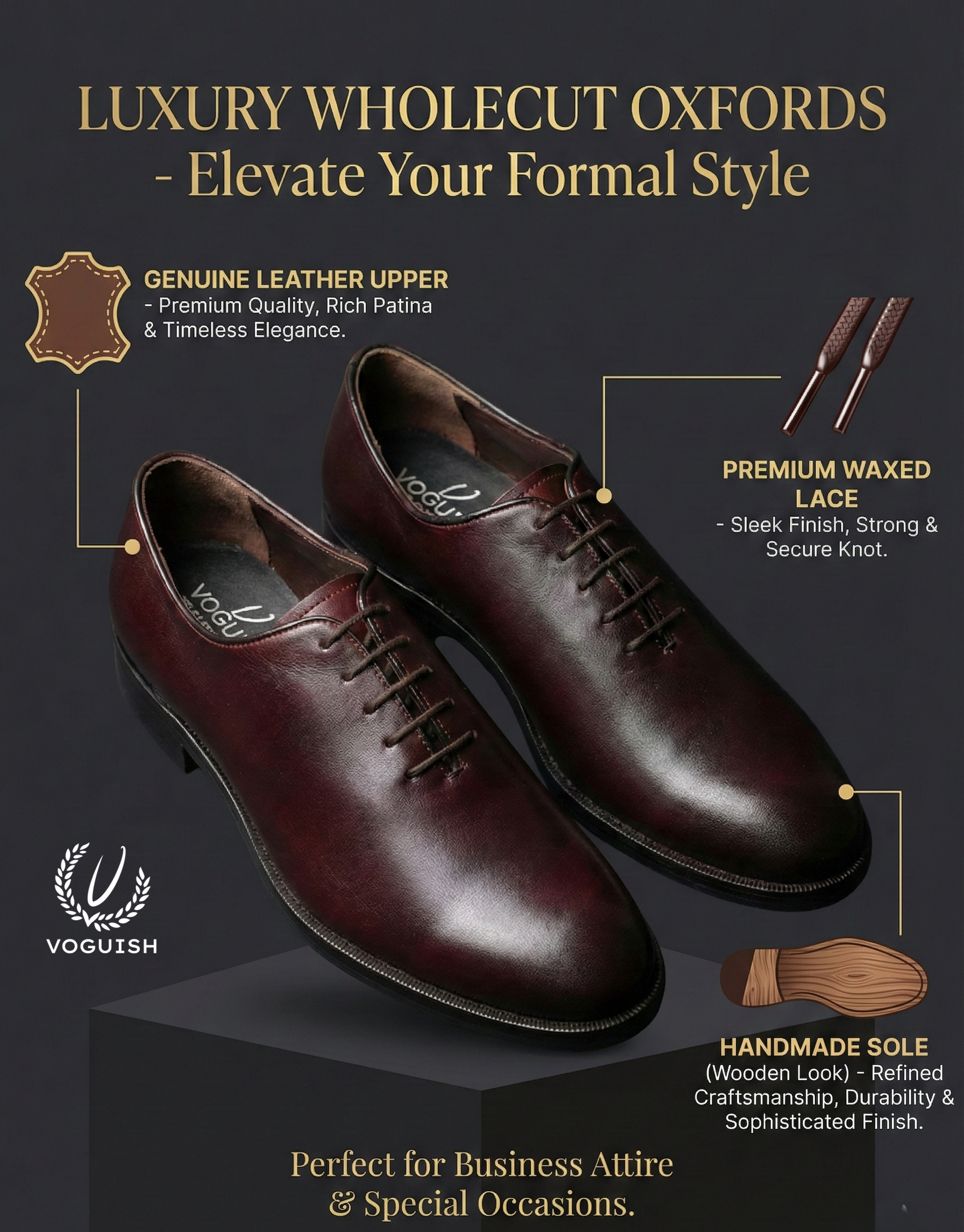 Step into a legacy of refinement. The Voguish Signature Oxford is more than just a shoe; it is the foundation of a distinguished wardrobe. Meticulously crafted from premium smooth leather, this pair features a rich, hand-burnished mahogany finish that offers depth and character rarely found in modern footwear.