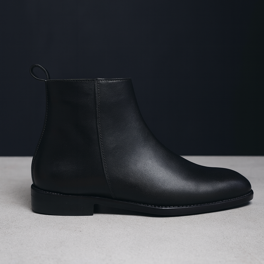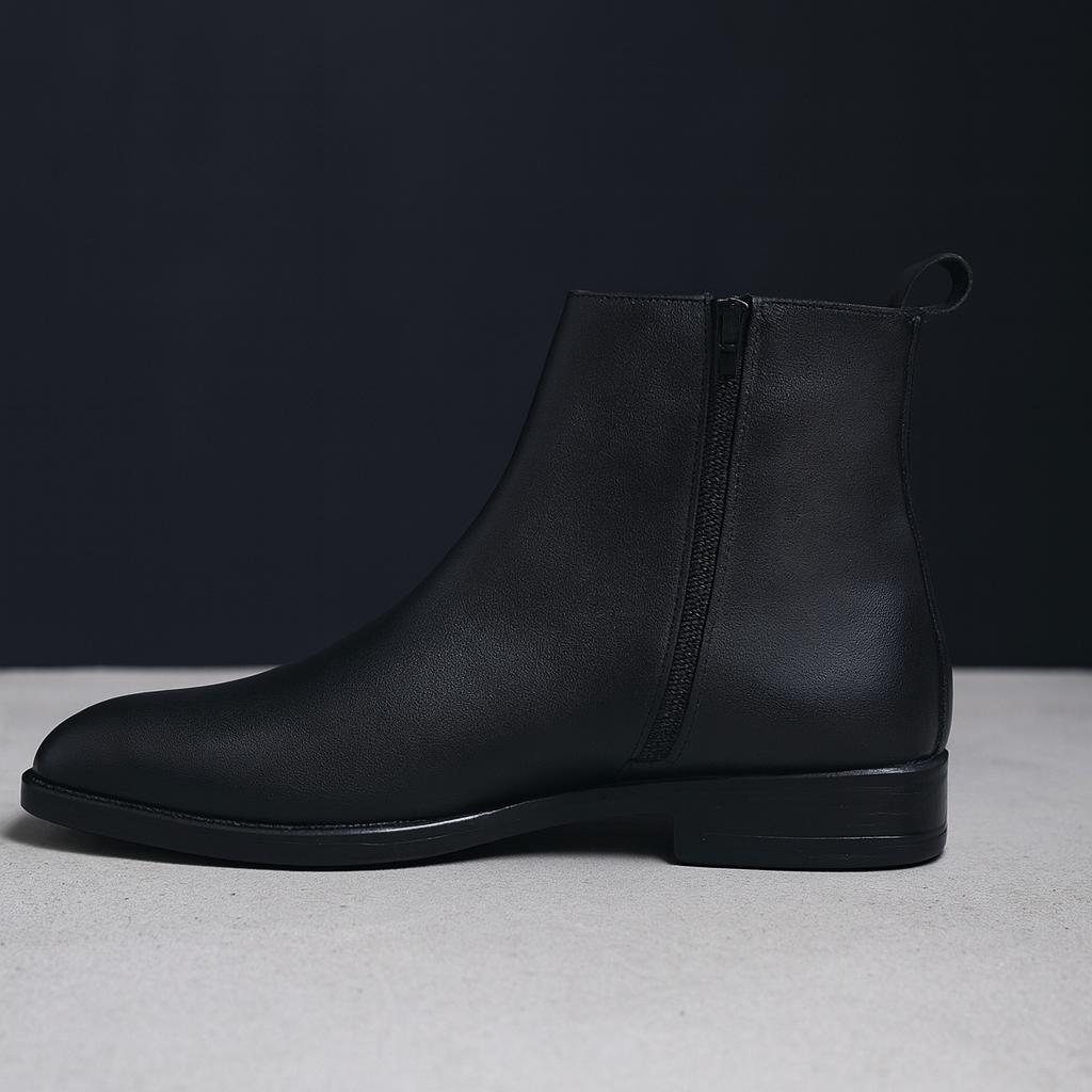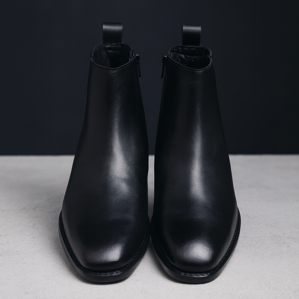 The standout feature is the premium metal chain detail, elegantly wrapped across the upper, adding a statement-making edge without compromising refinement. Constructed from high-quality genuine leather, the boot offers a smooth, polished finish that maintains its shape and richness over time.
